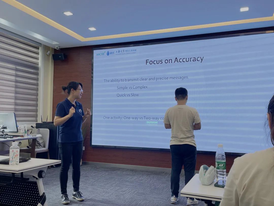 忻教授毕业于香港理工大学,在课堂上,她生动而幽默的讲解让学员们了解到了国际项目管理的基本要素和丰富的专业知识。同时,老师的讲述让大家知道了“一个上海本地人眼中的上海”,在那一刻,上海这座城市在我们的心中“少了一份生疏多了一份亲切”。知识源于实践,老师用两个小实验让我们从实践中更深刻地体验到了项目管理原理的内涵。