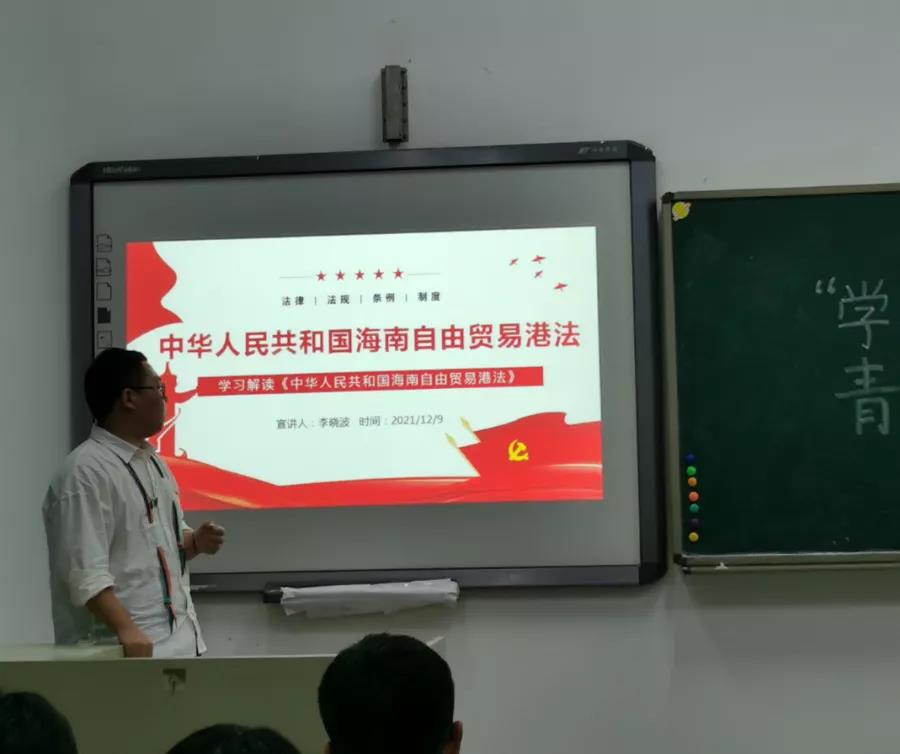 第二位宣讲人李晓波,从自身学习中华人民共和国海南自由贸易法的感悟出发,详细的解读了什么是自由贸易港,《海南自由贸易港法》出台目的、《海南自由贸易港法》立法进程、《海南自由贸易港法》亮点解读,并号召同学以实际行动为海南自由贸易港建设贡献青春力量。