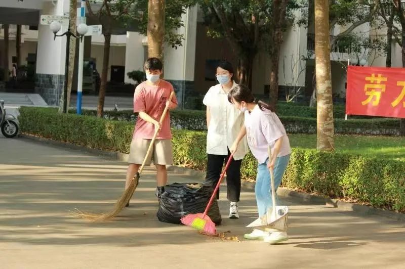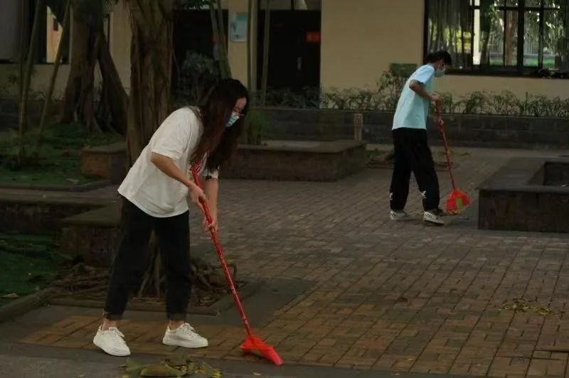 各位学生严格按照规定时间到达劳动场地,并遵守疫情防控要求戴好口罩,在老师的指导下领取打扫工具,并自觉分工分区打扫卫生。