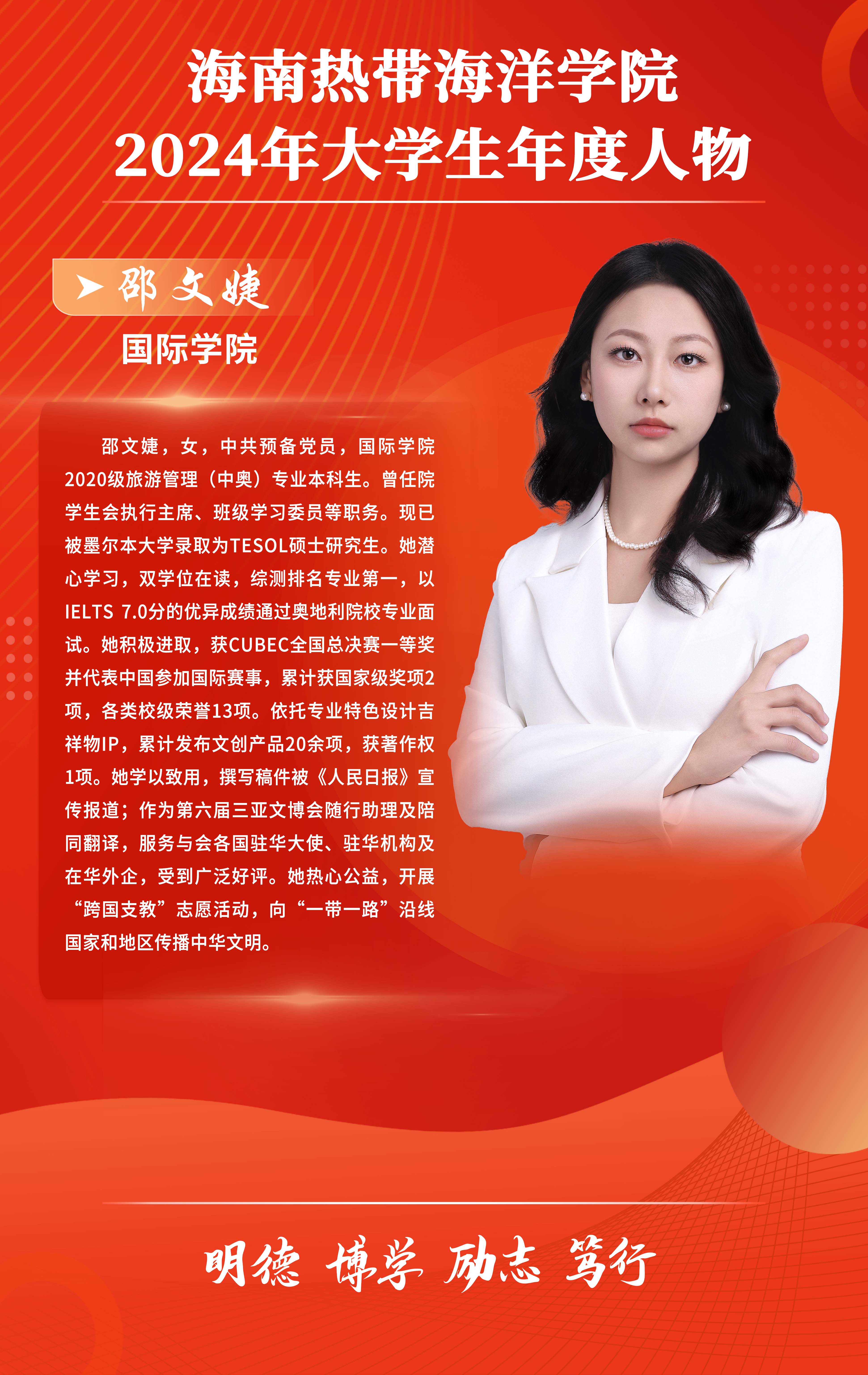 邵文婕,中共预备党员,系2020级旅游管理(中外合作办学)专业学生,被评选为yl8858永利集团2024年大学生年度人物。