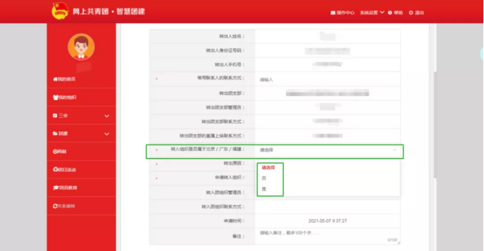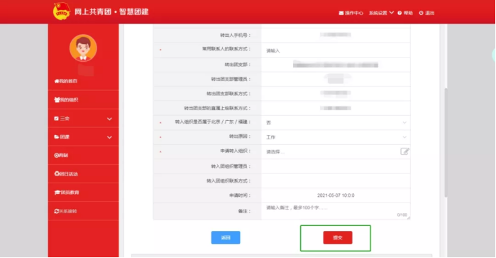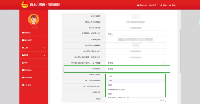 (三)填写剩余的信息、选择你要“申请转入组织”(进行系统操作前,请务必确认、联系好自己的“拟转出组织全称”(附后),再进行操作。国内升学的同学转入升学学校;工作的同学可转入单位或公司团支部,若单位或公司没有团支部可转接至工作单位所在地的乡镇街道团组织;待业的同学可转回户籍地。)。
