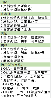 预订部的工作是将不同渠道来的预订订单做进酒店的系统中,有携程,美团等OTA平台,也有像民间,春秋等旅行社通过邮件发来的订单,还有就是需要接听客人的电话,回答客人对客房预订的一些问题以及询问入住人信息和需求,由于工作内容关系到客人的客房信息和能否顺利在前台办理入住,所以预订部的工作需要非常认真和细致。