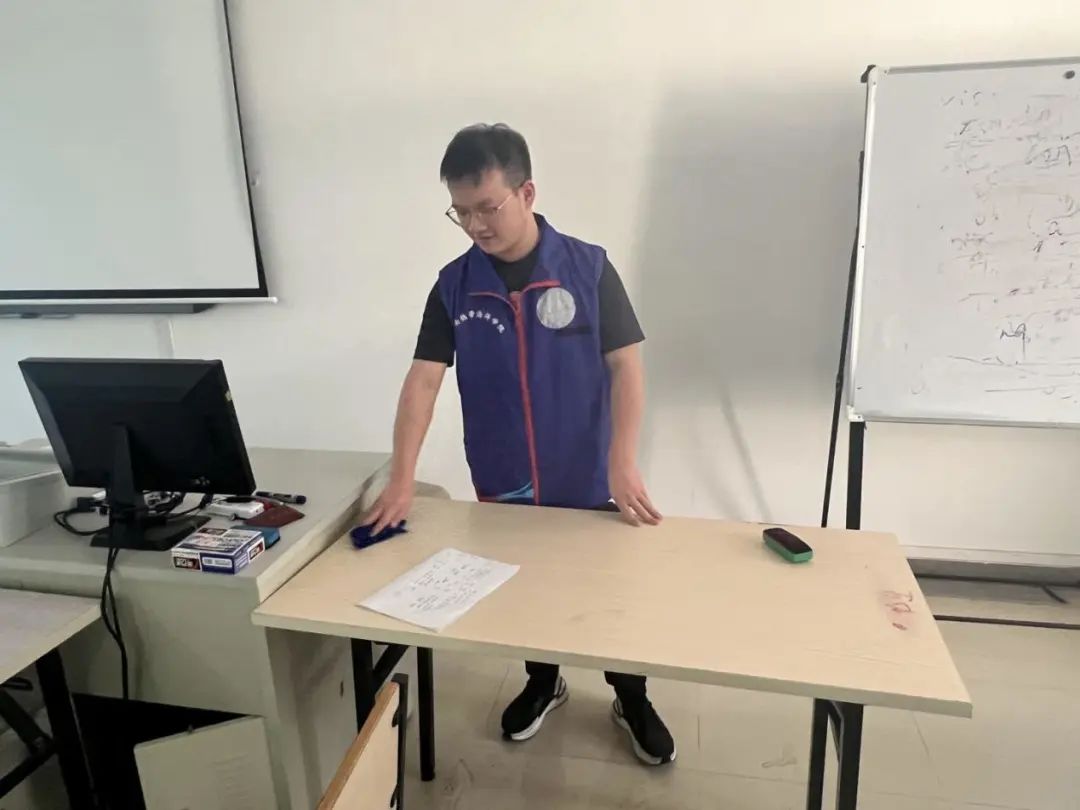 清扫活动在教学楼7栋的一部分教室里进行。志愿者们分工有序,配合默契,对教室里的桌椅、窗台与地板进行了系统地清理。期间,他们不怕脏,不怕累,努力克服了途中所遇到的困难。