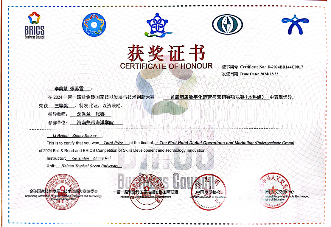 12月20日至22日,2024一带一路暨金砖国家技能发展与技术创新大赛(以下简称“金砖大赛”)之“酒店数字化运营与营销”赛项国内总决赛在广州工程职业技术学院隆重举行。来自全国80所院校的104支队伍共208名选手同台竞技,展示了酒店行业数字化转型的最新成果和未来趋势。经过三天激烈的比拼,我院2023级旅游管理专业学生李美慧和张蕊雪凭借出色的专业技能和团队协作,在本次大赛中取得三等奖,这也是我院首次在该赛道获奖。